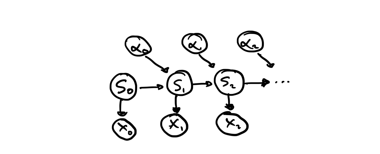 Example: Imagine you want to act to the world to protect yourself from the rain. Random variable is the observation of rain, is the action of getting an ombrela with you and is the state of the world that expresses itself as rain ( captures the amount of water in the cloud). These random variables are subscripted by and past with future variables are differentiated by subscripts and respectively.